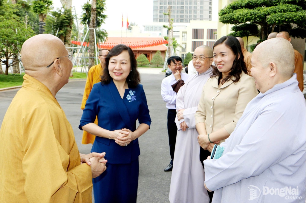 | Phó Bí thư Tỉnh ủy, Chủ tịch Ủy ban MTTQ Việt Nam tỉnh Huỳnh Thị Hằng trao đổi với thành viên Ban Trị sự Giáo hội Phật giáo Việt Nam tỉnh Đồng Nai. Ảnh: Văn Truyên |