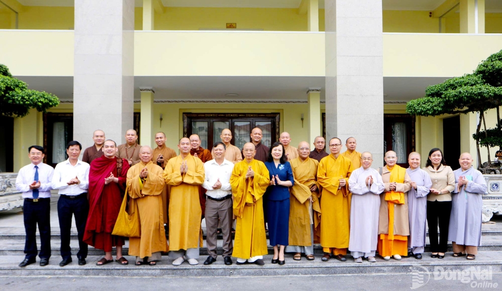 | Phó Bí thư Tỉnh ủy, Chủ tịch Ủy ban MTTQ Việt Nam tỉnh Huỳnh Thị Hằng chụp ảnh lưu niệm cùng đoàn Ban Trị sự Giáo hội Phật giáo Việt Nam tỉnh Đồng Nai. Ảnh: Văn Truyên |