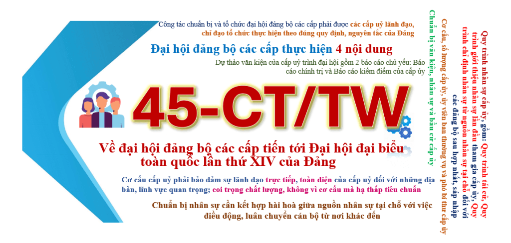 Về công tác chuẩn bị nhân sự và bầu cử cấp ủy, Chỉ thị 45 nêu rõ: Việc lựa chọn, giới thiệu nhân sự cấp ủy khóa mới phải quán triệt sâu sắc Nghị quyết số 26-NQ/TW, ngày 19/5/2018 của Ban Chấp hành Trung ương Đảng (khóa XII); tiêu chuẩn cán bộ nêu tại Quy định số 89-QĐ/TW, ngày 04/8/2017, Quy định số 214-QĐ/TW, ngày 02/01/2020 của Bộ Chính trị (khóa XII) và các quy định của Đảng, pháp luật của Nhà nước. Cấp ủy các cấp căn cứ vào yêu cầu, tiêu chuẩn chung nêu tại Chỉ thị này để cụ thể hóa cho phù hợp với tình hình, đặc điểm ở cấp mình theo quy định.