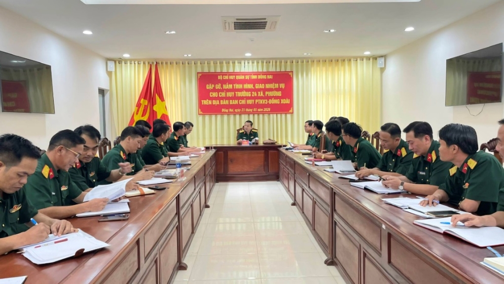 Chính ủy Bộ CHQS tỉnh gặp gỡ, nắm tình hình, giao nhiệm vụ cho Chỉ huy trưởng 24 xã, phường trên địa bàn Ban CHPTKV3 - Đồng Xoài
