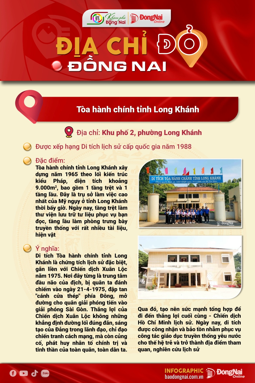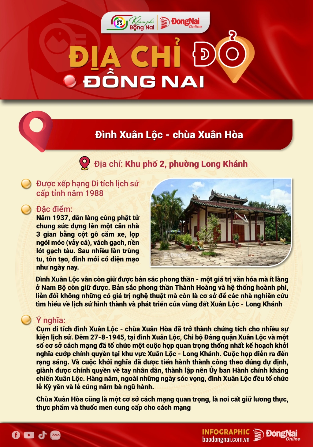 [Chuỗi Infographic] Địa chỉ đỏ Đồng Nai: Tòa hành chính tỉnh Long Khánh, Địa điểm Căn cứ Thị ủy Long Khánh, Cụm di tích Đình Xuân Lộc - chùa Xuân Hòa