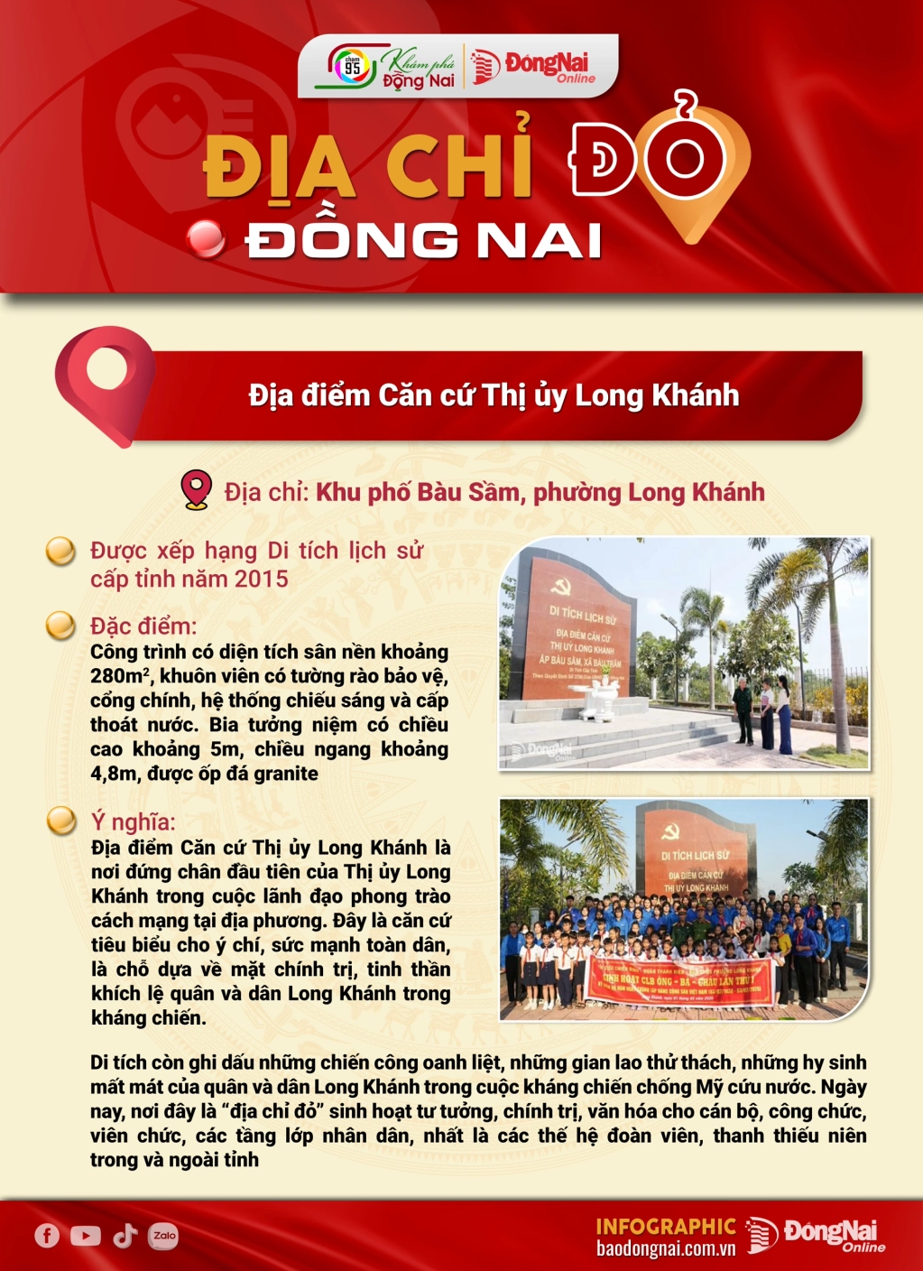 Đồng Nai còn là địa phương lưu giữ những giá trị lịch sử hào hùng với hệ thống di tích, địa danh cách mạng phong phú. Với mong muốn bồi đắp lý tưởng cách mạng và lòng yêu nước cho thế hệ trẻ thông qua cách tiếp cận hiện đại, chuỗi infographic sẽ giúp bạn đọc hệ thống hóa thông tin, trải nghiệm trực quan và gắn kết với các “địa chỉ đỏ” Đồng Nai.