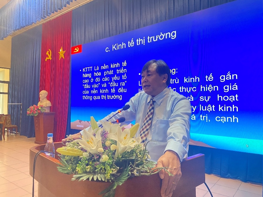 Lớp bồi dưỡng và cập nhật kiến thức được nghe PGS.TS Nguyễn Quốc Dũng trao đổi và báo cáo chuyên đề: Kinh tế thị trường định hướng xã hội chủ nghĩa và những thành tựu nổi bật qua hơn 35 năm thực hiện đường lối đổi mới do Đảng khởi xướng, lãnh đạo; Việc triển khai thực hiện Chương trình số 47-CTr/TU, ngày 06/6/2023 của Ban Chấp hành Đảng bộ tỉnh thực hiện Nghị quyết số 29-NQ/TW, ngày 17/11/2022 của Trung ương về tiếp tục đẩy mạnh công nghiệp hóa, hiện đại hóa đất nước đến năm 2030, tầm nhìn đến năm 2045 trên địa bàn tỉnh Đồng Nai.