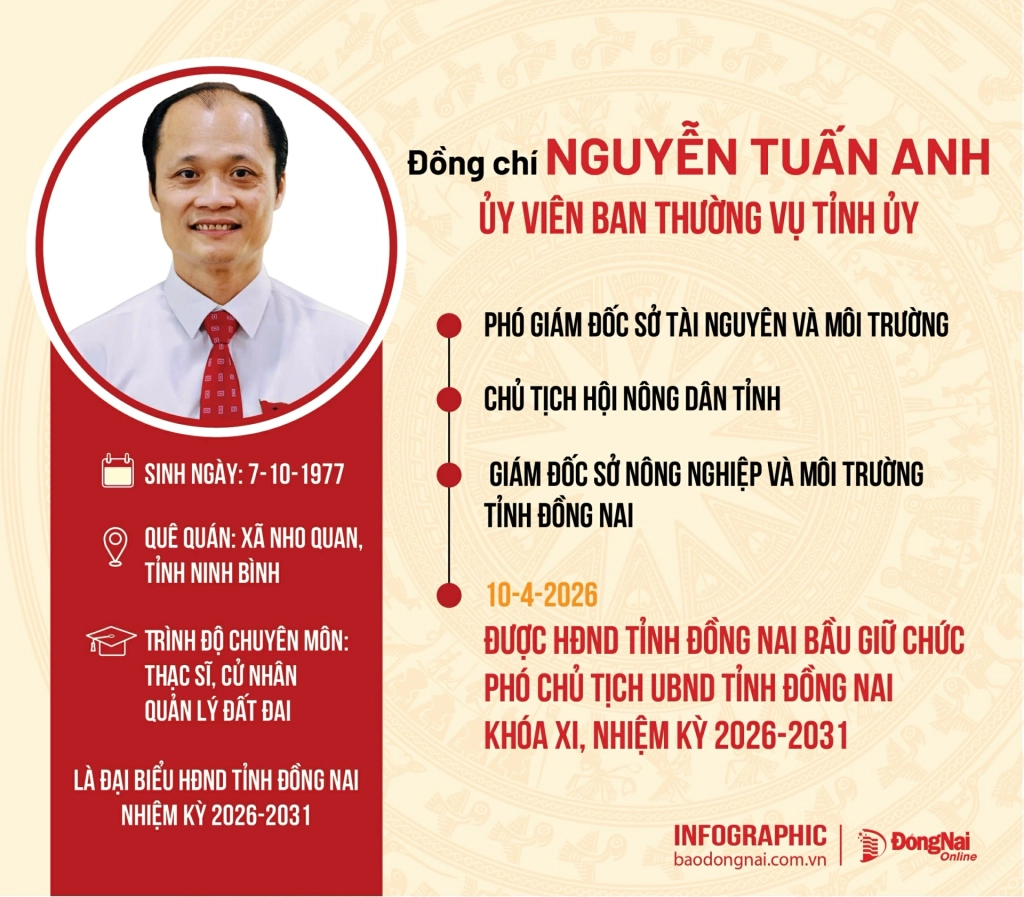 Đồng chí Nguyễn Tuấn Anh hiện là Ủy viên Ban Thường vụ Tỉnh ủy Đồng Nai nhiệm kỳ 2025-2030.