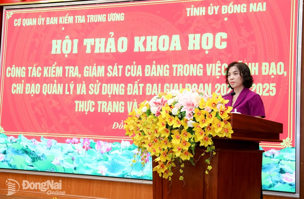 Phát biểu đề dẫn hội thảo, Phó Chủ nhiệm UBKT Trung ương, Chủ nhiệm đề tài B-BĐ.25-15 Trần Thị Hiền cho biết: Thực hiện đề tài khoa học Công tác kiểm tra, giám sát của Đảng trong việc lãnh đạo, chỉ đạo quản lý và sử dụng đất đai được Học viện Chính trị Quốc gia Hồ Chí Minh phê duyệt tại Quyết định số 3745-QĐ/HVCTQG, mã số B-BĐ.25-15, đề tài được nghiên cứu bắt đầu từ tháng 10-2025 đến quý III-2026 phải hoàn thành để bảo vệ cấp bộ.