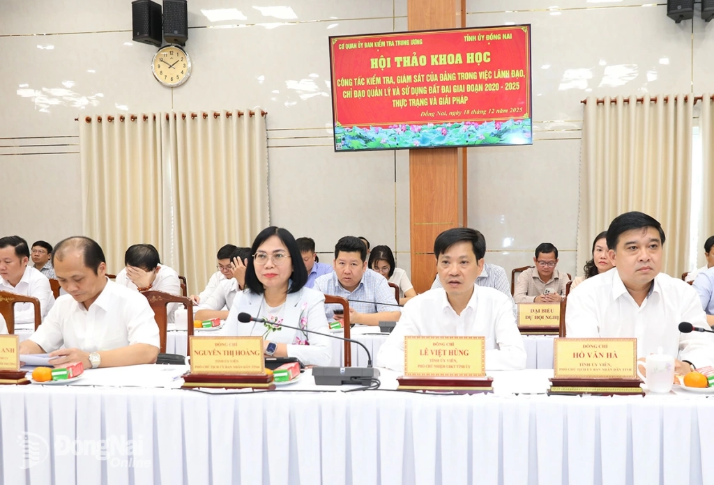 Chủ trì hội thảo có các đồng chí: Trần Thị Hiền, Phó Chủ nhiệm UBKT Trung ương, Chủ nhiệm đề tài B-BĐ.25-15 và Vũ Hồng Văn, Bí thư Tỉnh ủy, Trưởng đoàn Đại biểu Quốc hội tỉnh Đồng Nai.