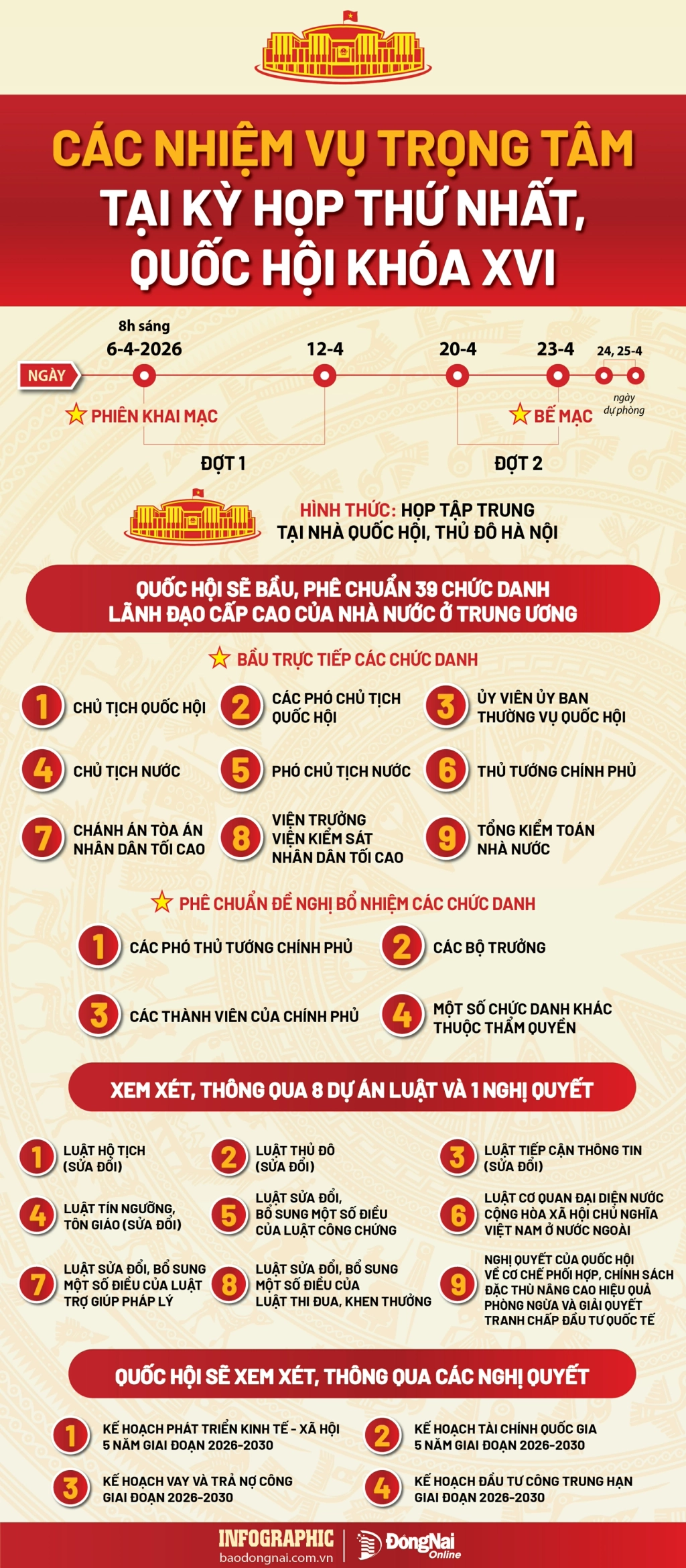 [Infographic] Các nhiệm vụ trọng tâm tại Kỳ họp thứ nhất, Quốc hội khóa XVI khai mạc sáng nay 6-4