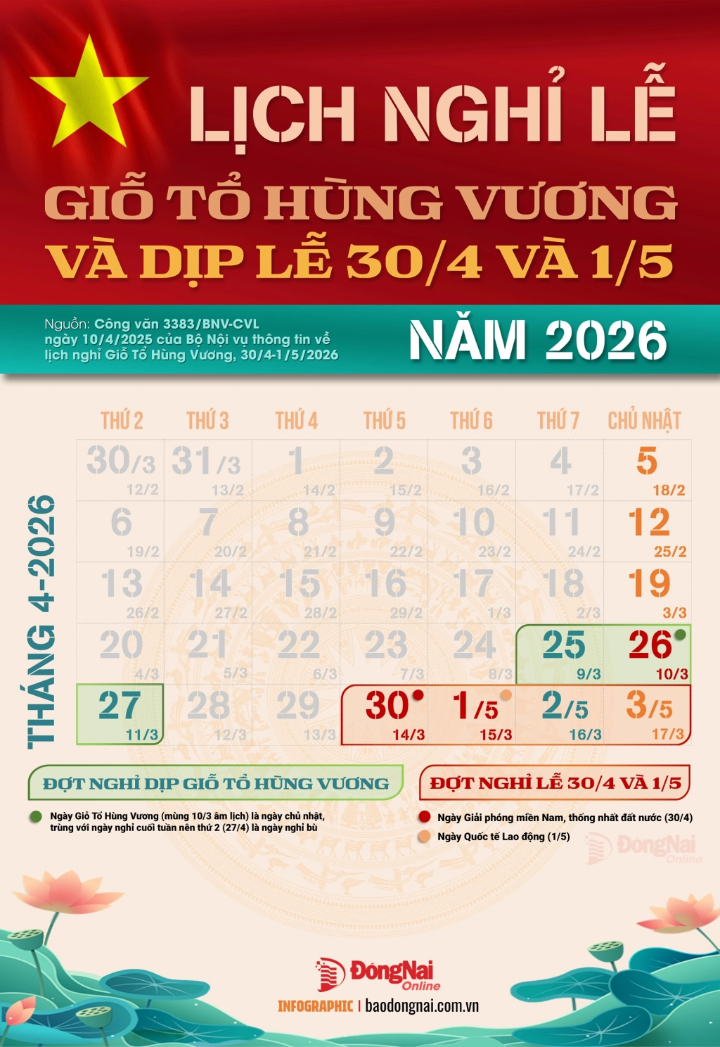 Đối với nghỉ lễ Giỗ Tổ Hùng Vương: Theo quy định, năm 2026, ngày Giỗ Tổ Hùng Vương rơi vào chủ nhật (26-4 dương lịch). Do trùng với ngày nghỉ cuối tuần, người lao động được nghỉ bù vào thứ hai (27-4). Tính cả 2 ngày cuối tuần, kỳ nghỉ kéo dài 3 ngày, từ thứ bảy (25-4) đến hết thứ hai (27-4).