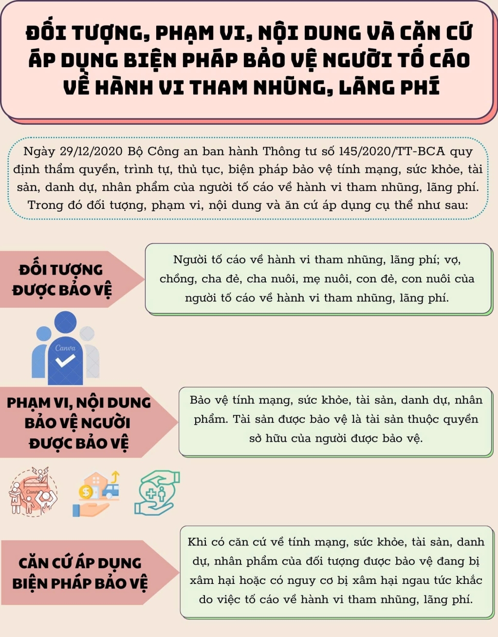 (Infographic tuyên truyền về đối tượng, phạm vi, nội dung và căn cứ áp dụng biện pháp bảo vệ người tố cáo về hành vi tham nhũng, lãng phí)