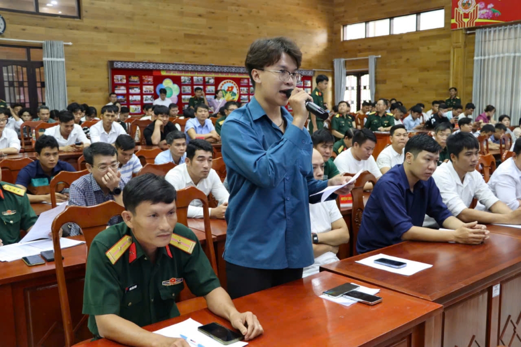 Đảng viên xuất ngũ phát biểu ý kiến tại buổi đối thoại giữa Bí thư Tỉnh ủy với thanh niên hoàn thành nghĩa vụ quân sự trở về địa phương năm 2024