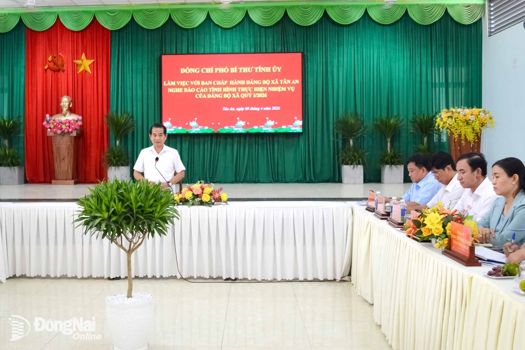 Đồng chí Phó Bí thư Tỉnh ủy nhấn mạnh: Tiềm năng, lợi thế của Tân An rất lớn, xã cần đưa ra các kế hoạch phát triển cụ thể trong thời gian tới. Đặc biệt, xã cần tập trung công tác giải ngân vốn đầu tư công; thực hiện bồi thường giải phóng mặt bằng đối với các dự án trọng điểm đi qua địa bàn xã. Quản lý chặt chẽ không để khai thác, xây dựng trái phép, không phép.