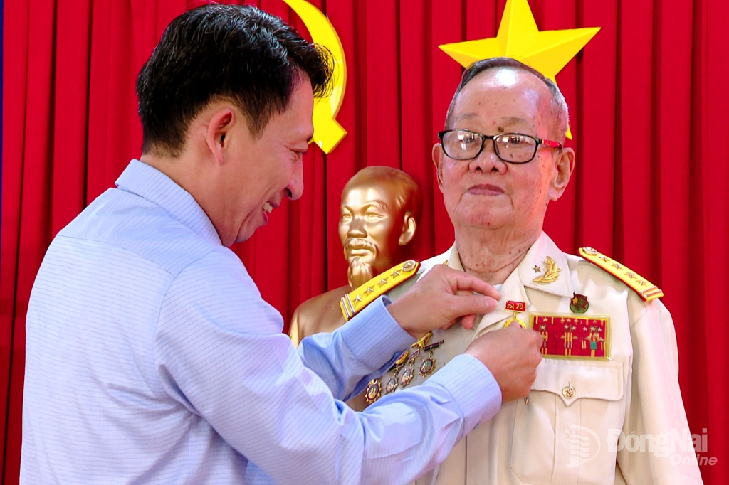 | Đồng chí Lê Xuân Thích, đảng viên Chi bộ ấp Hòa Hợp, xã Xuân Định nhận Huy hiệu 60 năm tuổi Đảng. Ảnh: Hoàng Vũ |